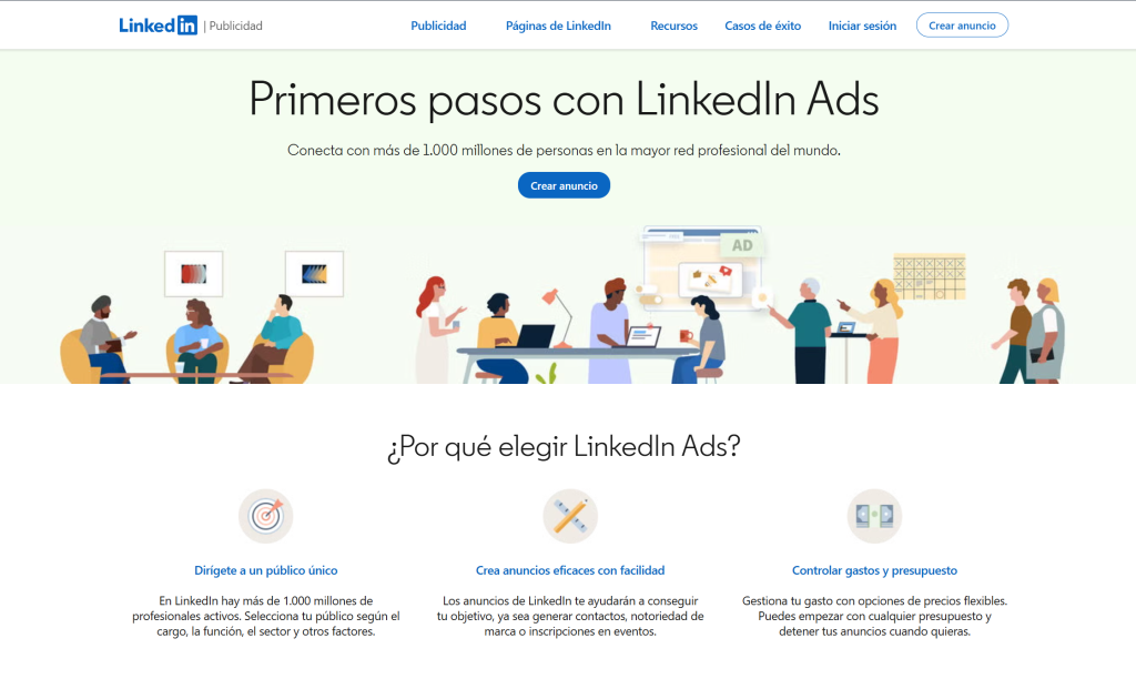 LinkedIn Ads se gestiona desde el Administrador de Campañas, donde eliges objetivos, presupuesto, público y formato de anuncio.