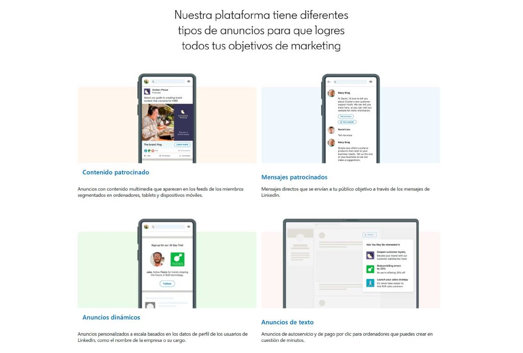 LinkedIn ofrece varios formatos y tipos de campañas según tu meta.